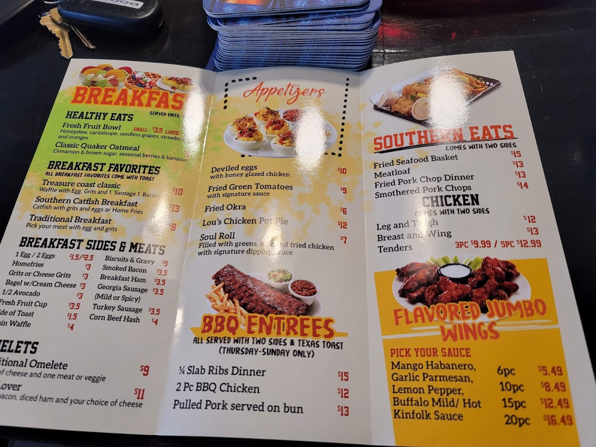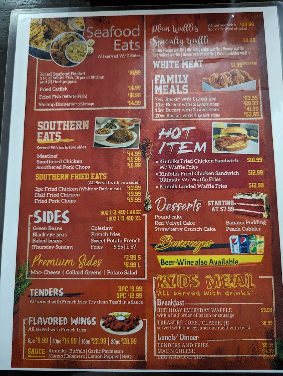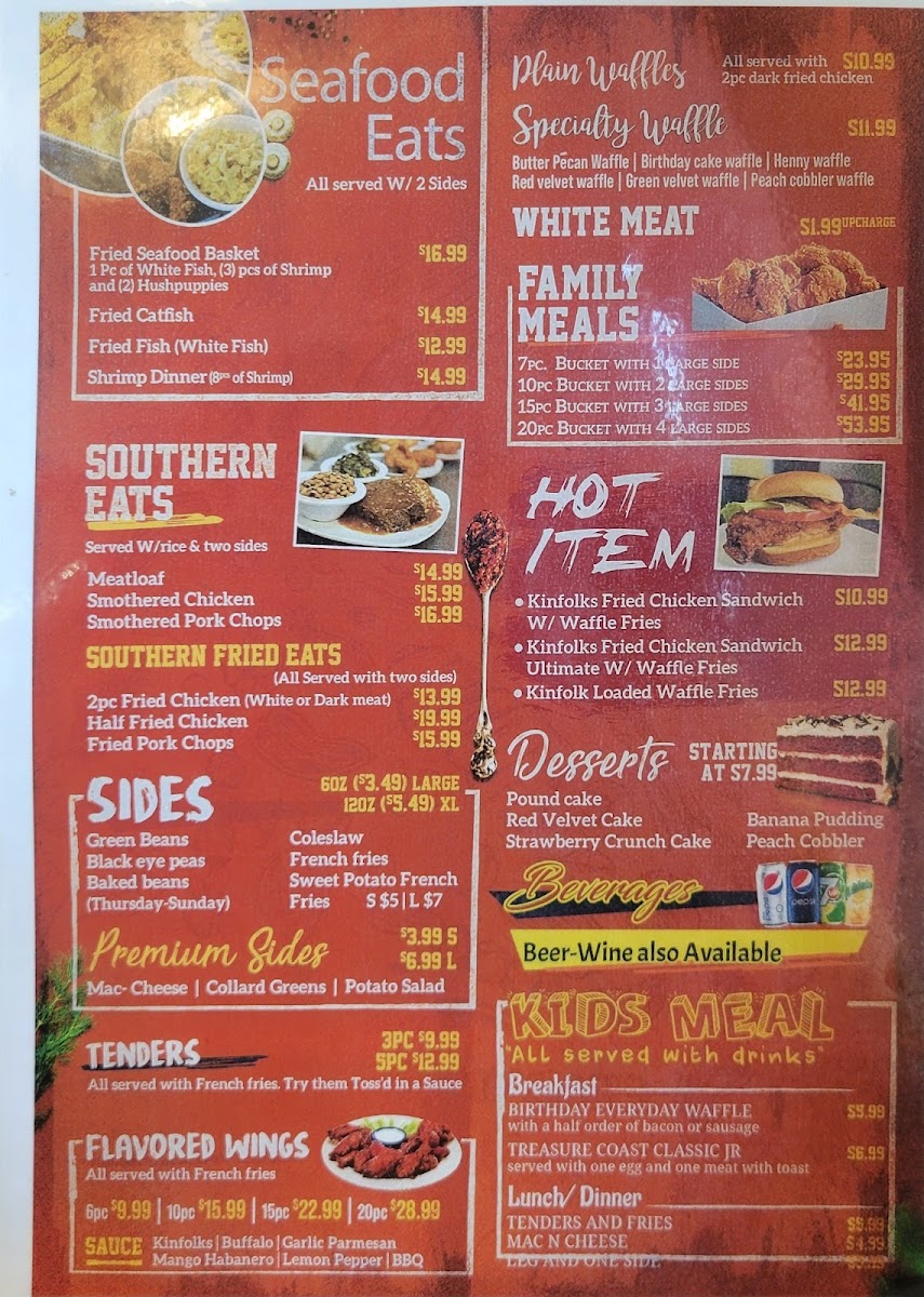 Breast and wing dinner with choice of 2 sides. Options include mac and cheese, collard greens, green beans, potato salad, and more.